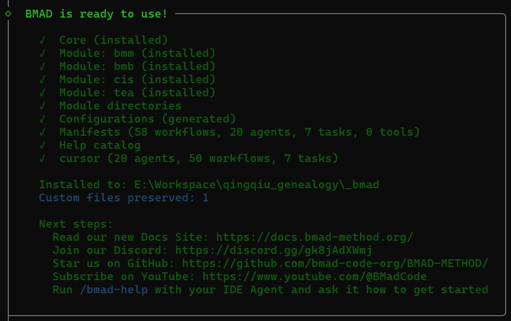 首先,你需要在项目中安装BMAD-METHOD框架。通常可以通过简单的命令完成,安装过程会自动创建必要的目录结构和配置文件。